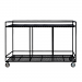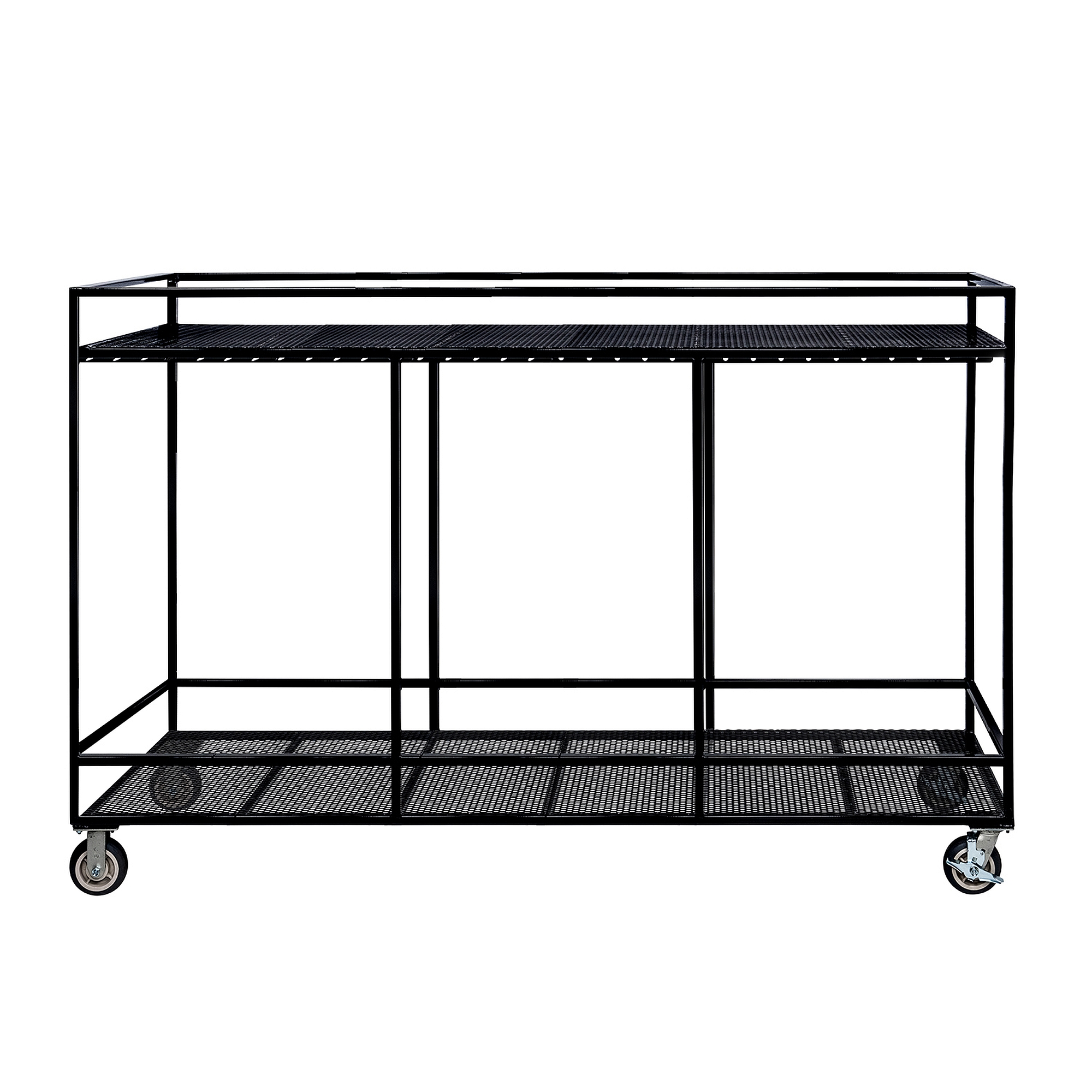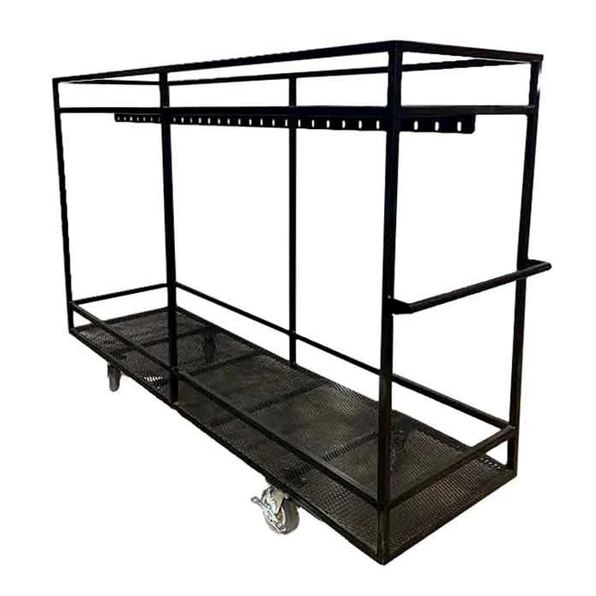 The hanger bar is slotted to keep the uniforms from bouncing off during transport.  The structure of the cart is larger than standard hangers to keep the uniforms inside the cart.  The top and bottom hat box decks have railings to keep everything from sliding off.  The casters are mounted completely under the cart – this allows you to secure the loaded cart to the sides of your truck or trailer.
