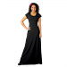 Scoop neck, cap sleeve, floor length gown with set-in-front empire waistband. Features back ties and no back zipper.